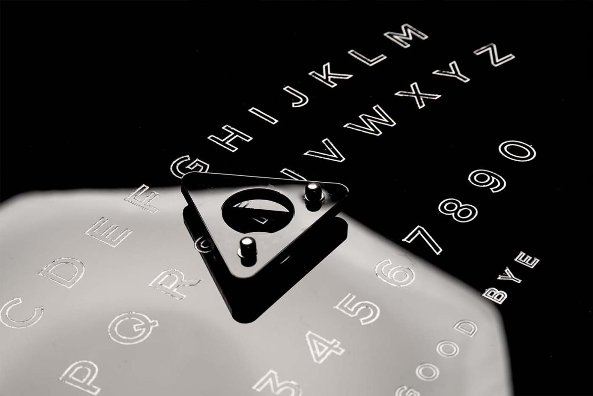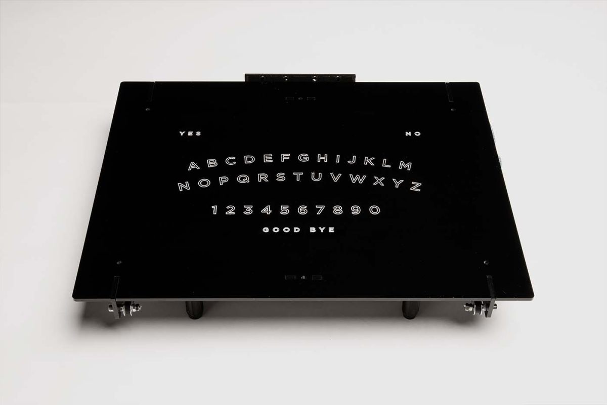 AUGMENTED OUIJAIn times of the omnipresent digital alter ego, more than a decendent’s empty shell is left behind in this world. If wished for or not explicitly prevented, their social media profiles remain unchanged. They keep projecting the same virtual representation of the deceased user as they did during their lifetime. This augmented ouija board accesses the Facebook profile of a deceased person and displays the found information by moving the planchette across the board.