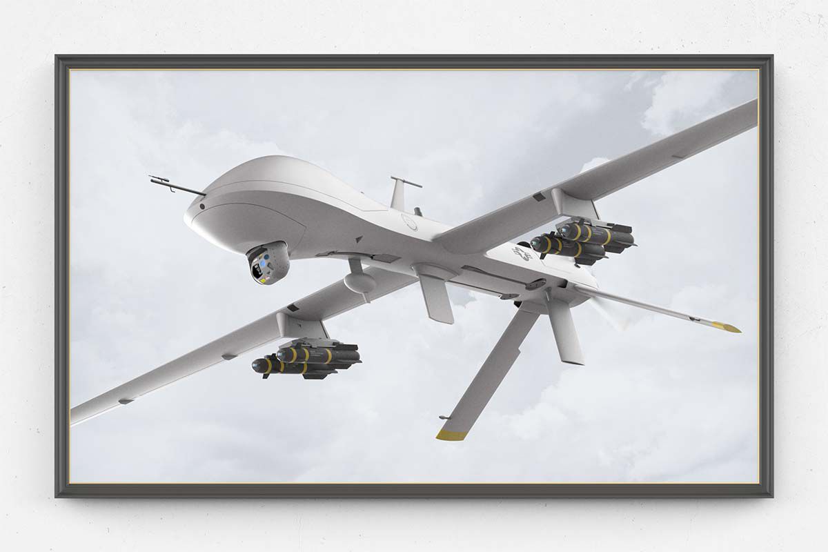 Contemporary War Art I is an animated rendering of an attack drone. The animation is projected onto a representative picture frame, inspired by those used for framing war paintings in the first half of the 20th century.