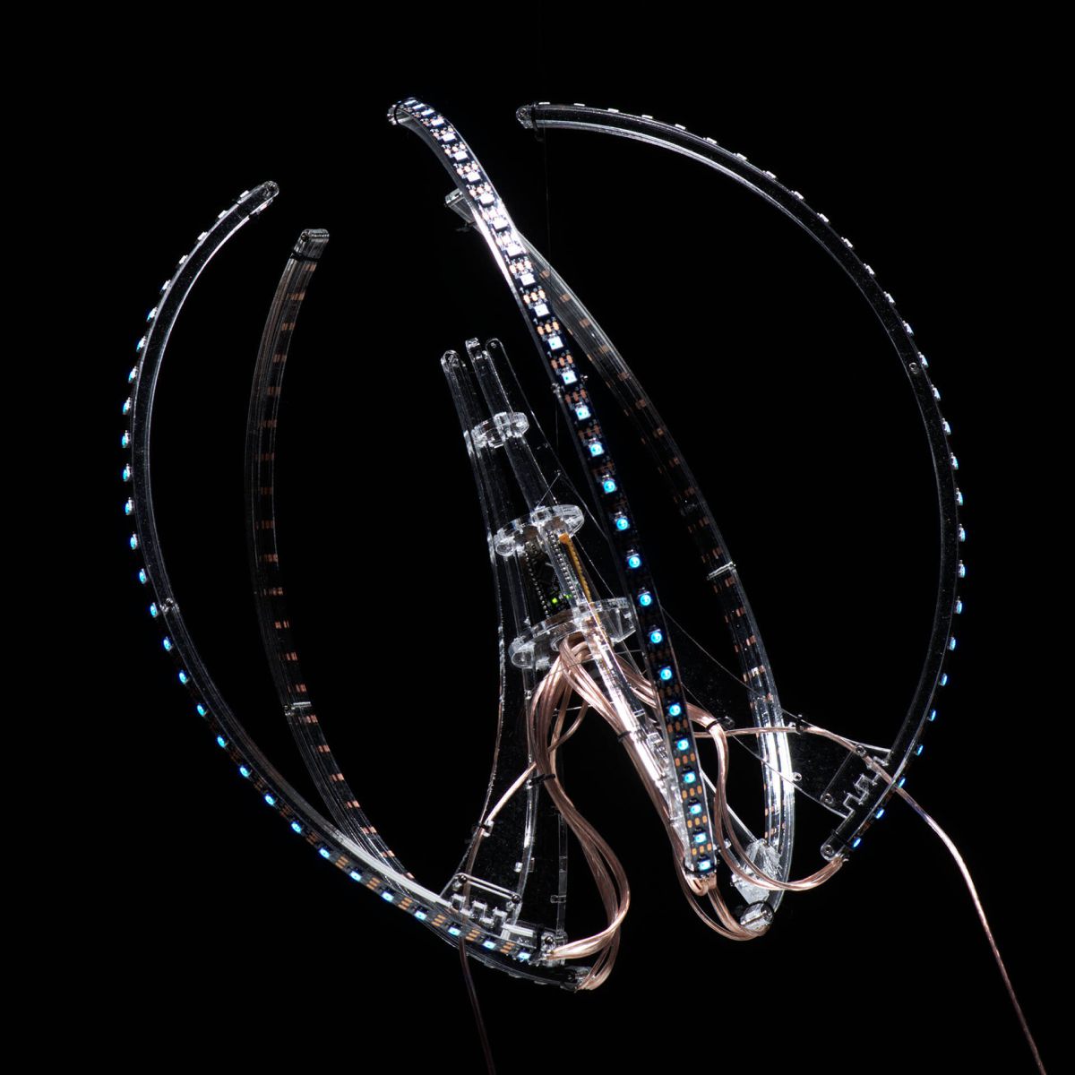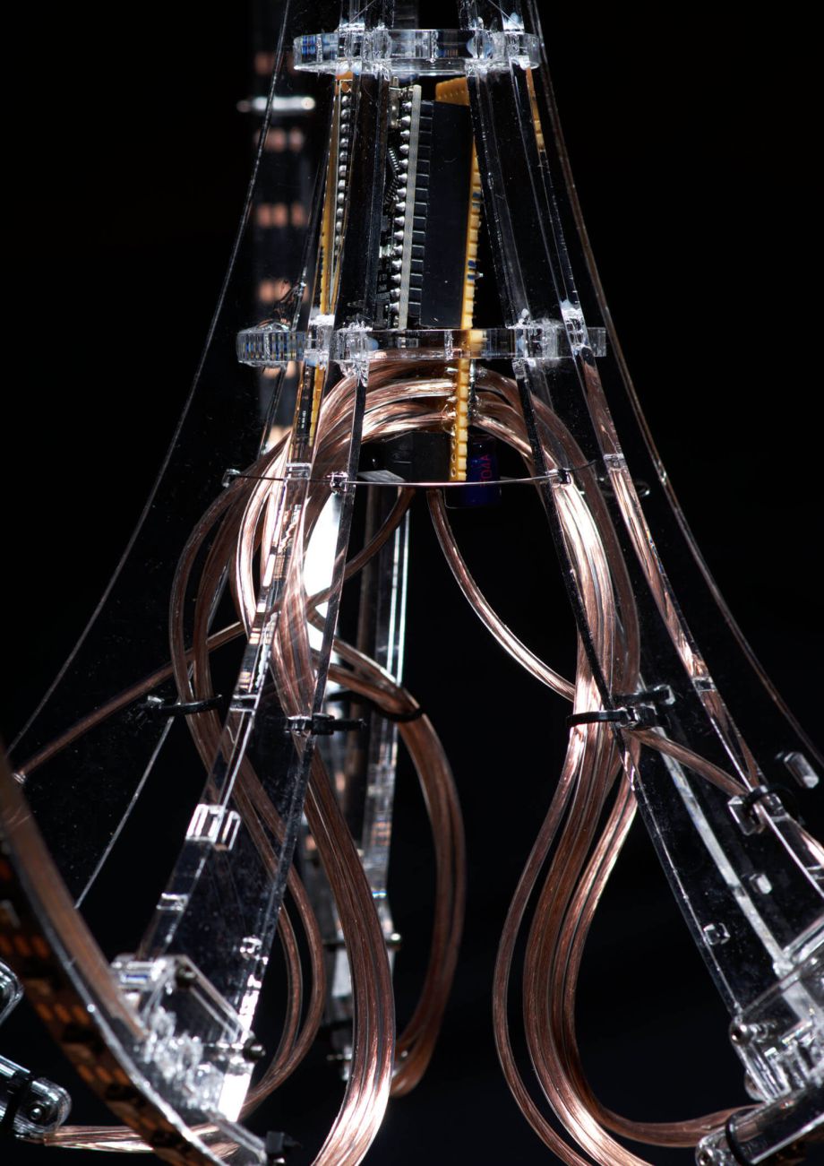 Mimicking the glowing patterns of its natural counterpart, the Sea Gooseberry, this electronic installation it is able to interact with other species and its environment with glowing patterns.Link to video on Vimeo
