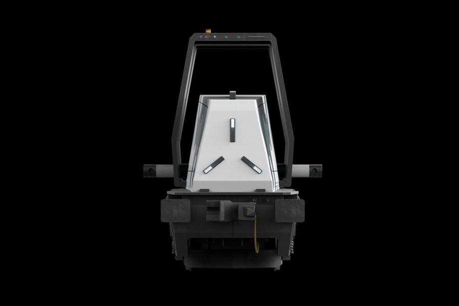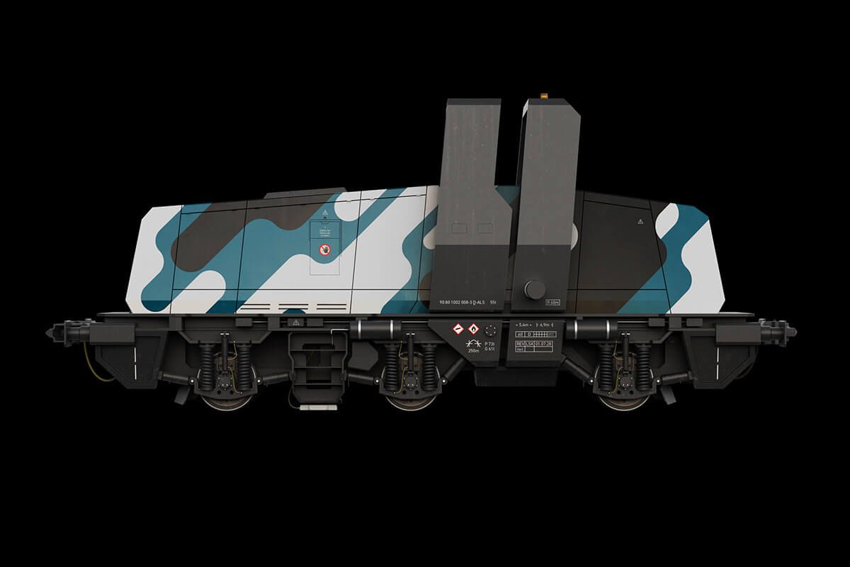 While the silhouette is reminiscent of a regular european shunting locomotive, the characteristic central frame accentuates the driverless autonomy of the drone while providing a heightened platform for the multisensor suite. The voluminous central engine compartment with its angular outlines represents traction, power and forward drive.